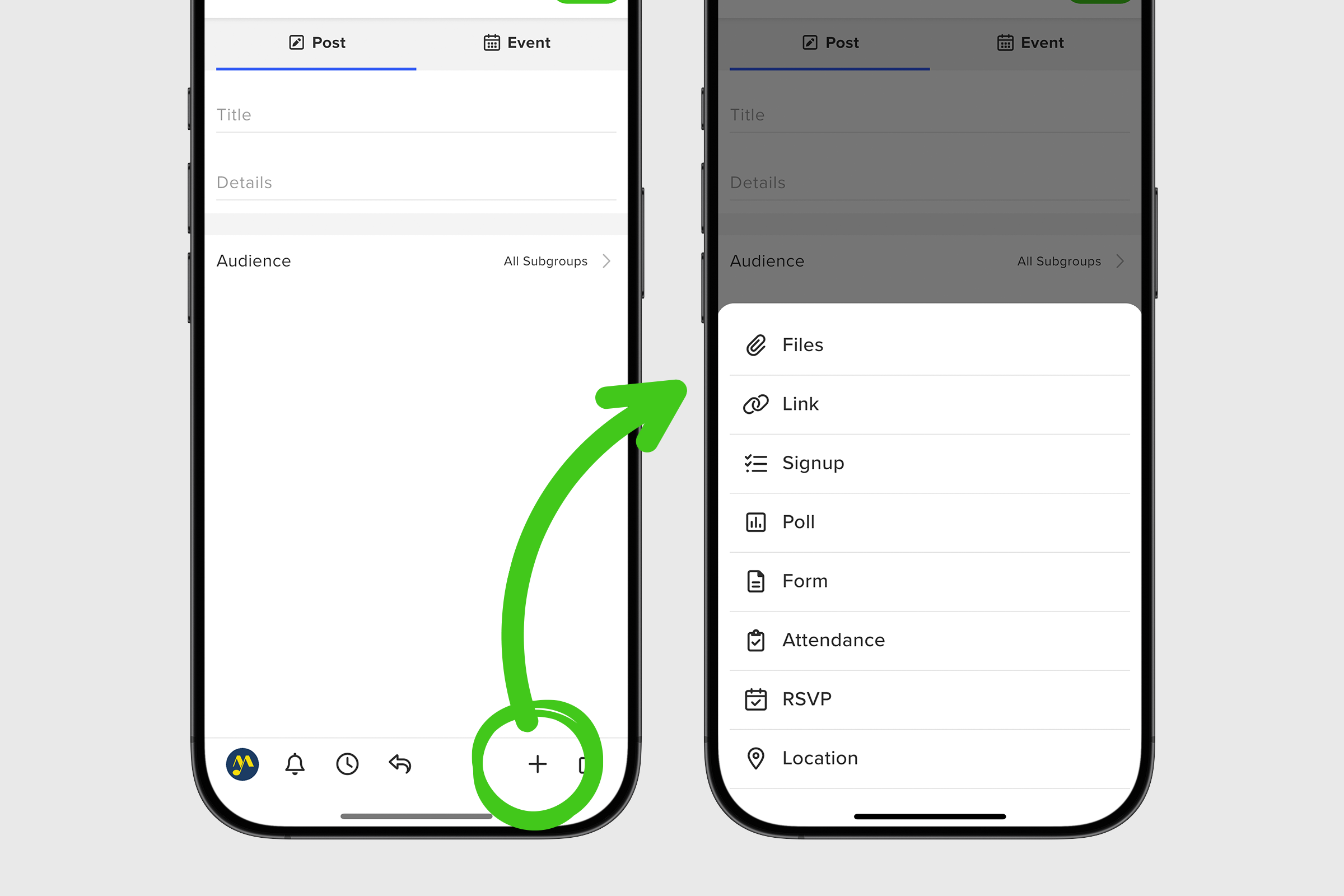1. From the create post screen, start by giving your new post or event a title, description, and add any optional details.