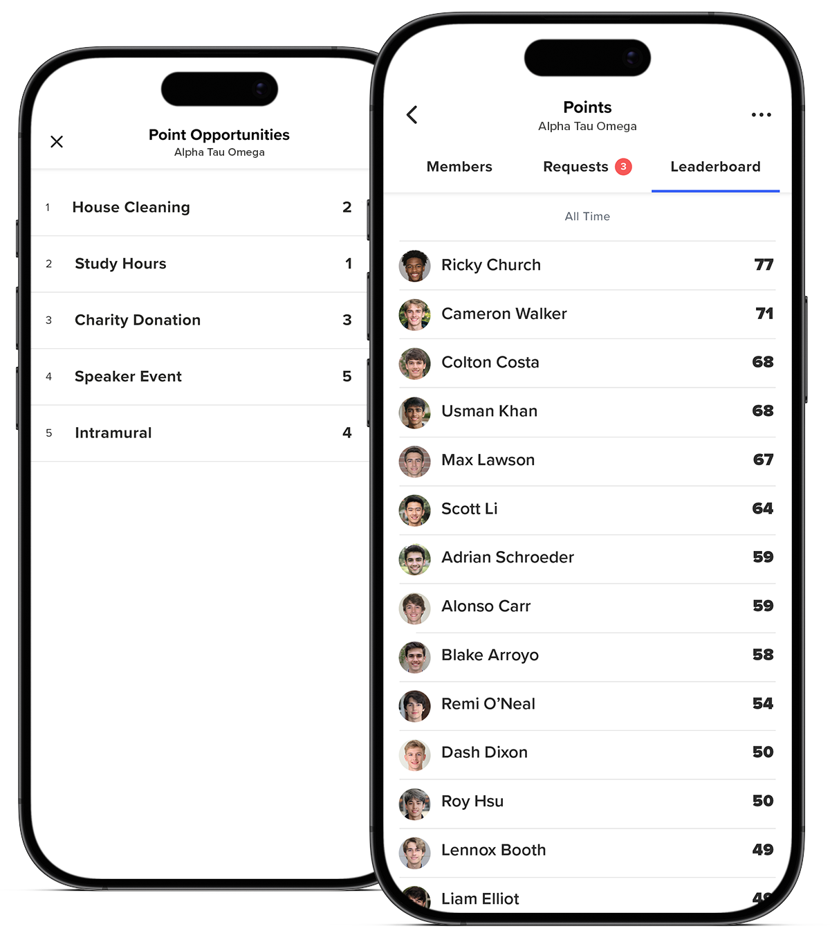 Organizing points for things like housing placement and social eligibility has never been easier. Admin can link Points to Attendance, Signups as well as Custom activities. Admins can create a standardized menu of common point opportunities, making it easier for both admins to award points and members to request them. Admins can approve point requests, and groups can enable a Leaderboard to display member progress.