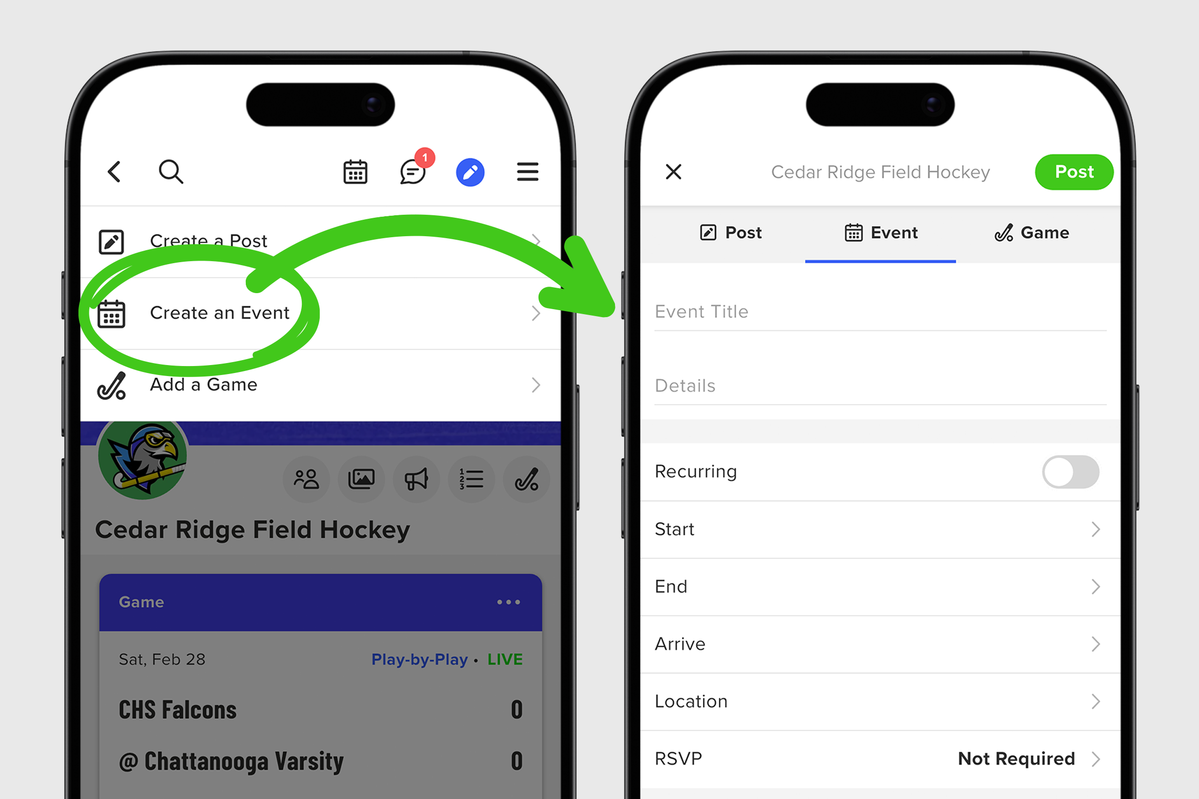 When creating a post, you first need to choose your post type. Most groups have two choices, Create a Post or Create an Event, but teams have a third choice, Add a Game. This third post type could also be listed as Match, Meet, or Competition depending on the nature of your team.