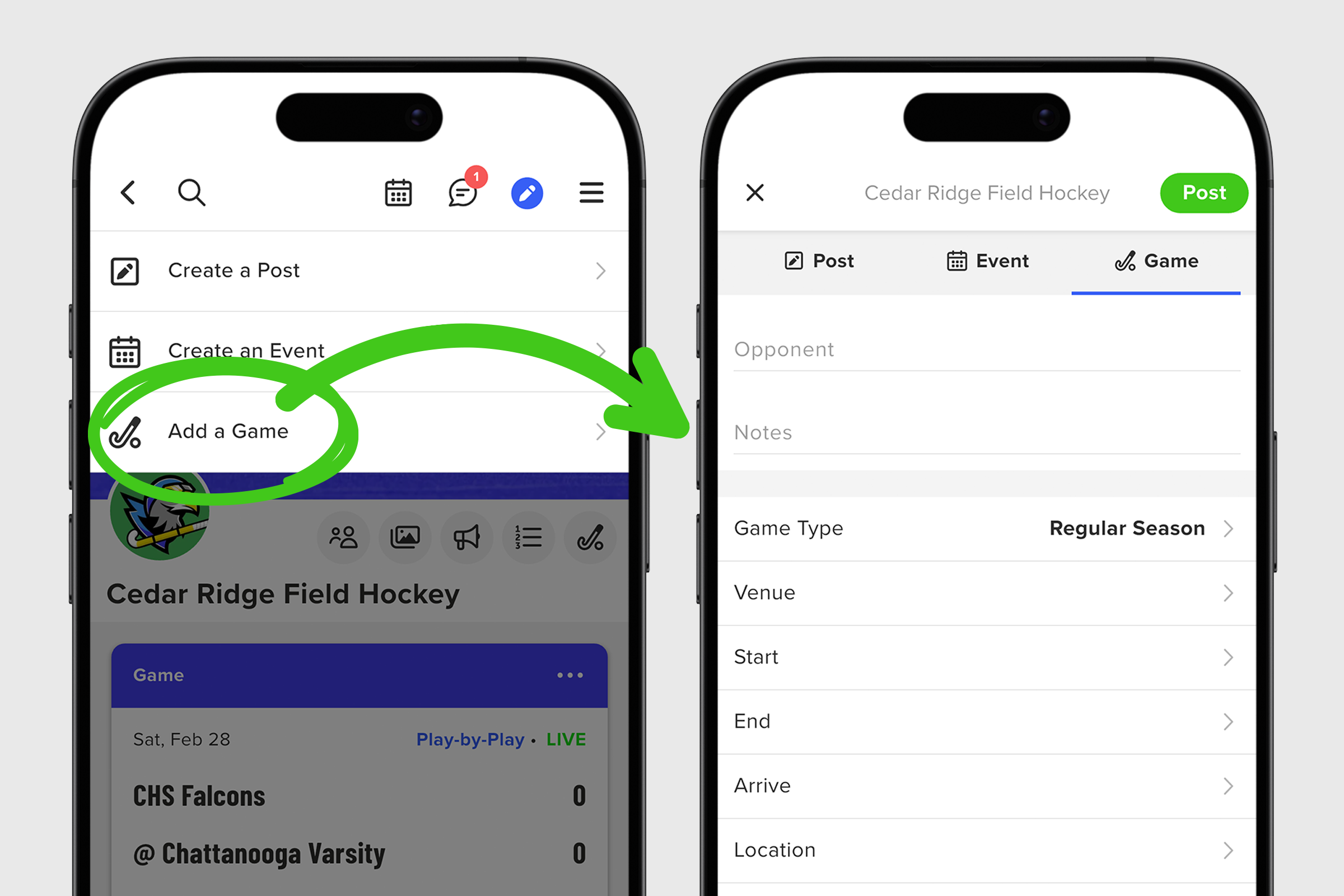 4. For groups like sports teams, booster clubs, or academic groups, there’s a third post type, Add a Game. These are special event competitions with specific details like opponent, team, and venue.