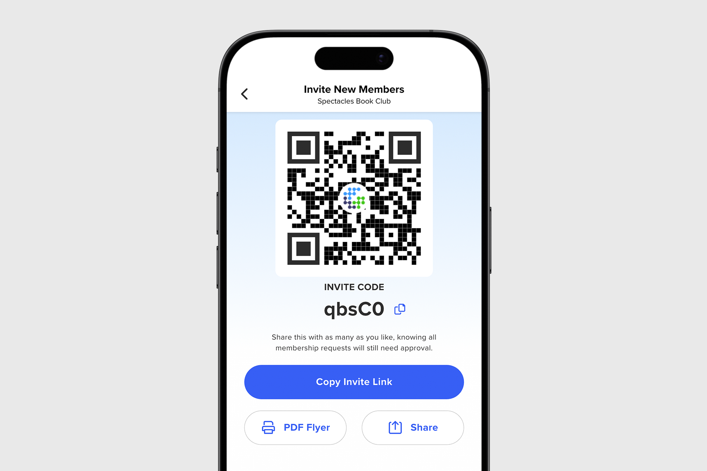 2. On the next screen, choose how you'd like to invite new members: Share Invite, Copy Invite Link, Access PDF Flyer, or Scan QR Code.